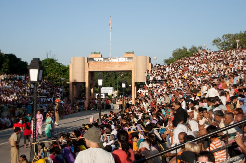 De reden dat al die mensen hier naar toe komen is de “ceremoniële” sluiting van de grens. Eigenlijk is het meer een soort interland als bij het voetbal. Aan weerszijden van de grens staan tribunes en die zitten nu afgeladen met joelende mensen die opgezweept worden hun chauvinisme zoveel mogelijk te tonen. Wij zitten uiteraard in het tumult van de Hindustan hoek, maar ook de Pakistani laten zich minstens zo hard horen.