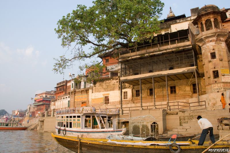 We wandelen naar de Ganges waar de Ghats zijn die Varanasi zo een indrukwekkende bestemming maken. De Ghats zijn oude paleizen van Maharadja's en andere hooggeplaatste Indiërs uit het verleden die op de oever van de Ganges zijn gebouwd. Op de trappen aan het water spelen zich allerlei rituelen af en vindt het dagelijks leven van velen plaats. Vele gelovigen komen hier om te bidden en baden in het water van de heilige rivier. Die inmiddels zo vervuild is dat men zegt dat alle leven in het water onmogelijk is geworden. Nog los van alle zichtbare zooi die er ronddrijft. Maar het blijft de heilige rivier en gebaad wordt er dus! Overigens ook gezien aan de oever; kleine jerrycans te koop om het heilige water ook mee naar huis te kunnen nemen.
