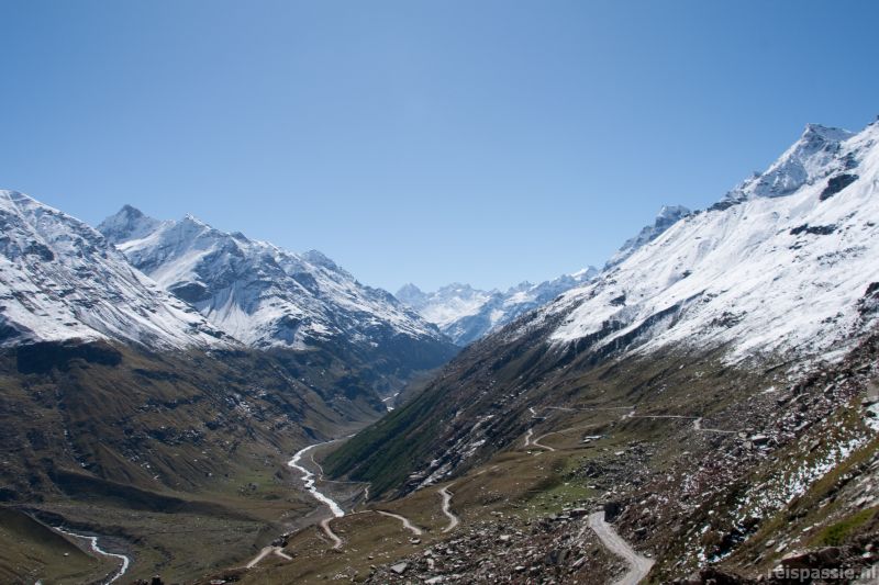 We gaan direct omhoog over een stuk weg dat in erbarmelijke staat is. Je kan goed zien dat de regen ook hier heeft huisgehouden. Hele stukken zijn verdwenen of liggen vol met stenen. De uitzichten zijn nu al fantastisch, groene dalen met witte toppen. De eerste pas is de Rohtang La. Echt veel sneeuw ligt er niet meer. Vervolgens dalen we wat af naar een aantal dorpjes in het dal erna. In Keylong stappen al onze medereizigers uit en er komt niemand meer bij. Het is ongelooflijk maar we hebben nu dus gewoon het hele busje voor ons zelf!