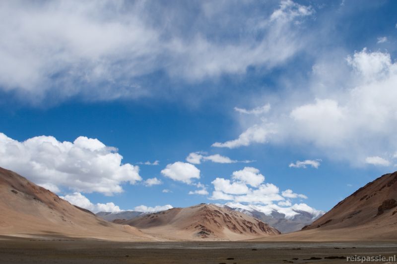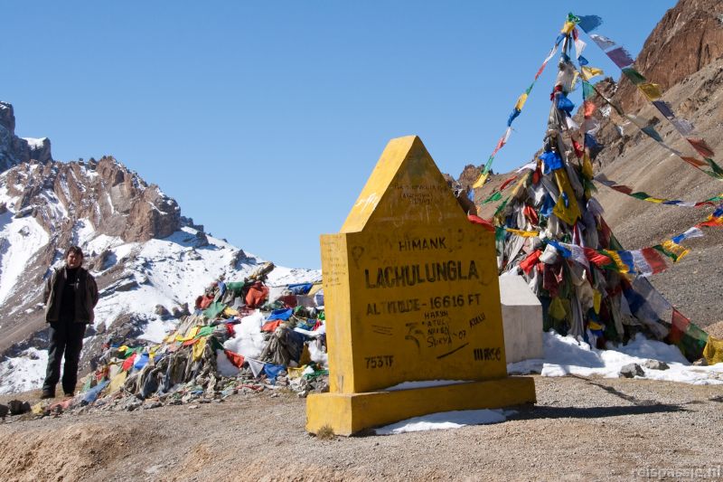 Vervolgens staan we snel op de top van de pas, de Taglang La van 5260 meter. De vrachtwagens van de wegwerkzaamheden gebruiken dit ook als keerpunt en enorme stofwolken gieren om de stupa met gebedsvlaggetjes. Als ze weer verdwenen zijn kunnen we even genieten van de enorme uitzichten. Niet te lang, daarvoor is het te koud.