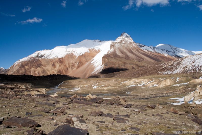 Vervolgens weer omhoog. Het landschap is veranderd naar een dorre steenwoestijn. Alleen nog wat kleine struiken staan eenzaam tegen de berghelling. Wel de meest geweldige kleuren in het zachte licht van de namiddag. De eerste serieuze pas volgt, de Baralacha La van 4950 Mtr. Hier staan we in een witte wereld. De sneeuw steekt prachtig af tegen het diep donkerblauw van de hemel. Het waait behoorlijk op de top en is dus ook aardig koud.