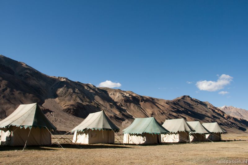 Dan volgt een korte afdaling tot 4400 Mtr waar we in een dal voor Sarchu gaan overnachten. Op een hooggelegen vlakte zijn hier een aantal tentenkampen. We stoppen bij de eerste en hebben weer eens behoorlijk mazzel. Het blijkt de laatste dag te zijn dat ze hier staan. Een deel is al afgebroken, de rest pakken ze morgen in en gaan dan terug naar Manali. Het seizoen is voorbij. Maar een tent voor vannacht is er gelukkig nog wel. Het zijn mooie grote tenten met behoorlijke bedden en dikke dekens! Die zullen nog wel nodig zijn!