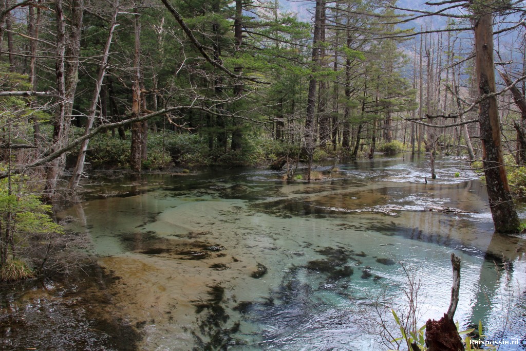 Bij het busstation op de eindbestemming eerst een buskaartje gekocht voor vanmiddag naar Takayama en de rugzakken in een opslag gedeponeerd. En dan op pad met het routekaartje in de hand. Er zijn hier diverse wandelpaden. Van korte rondjes tot meerdaagse trekkings over de toppen in de omgeving. We beperken ons maar tot een rondje in het dal langs de rivier. Op een aantal plaatsen zijn bruggen over de rivier zodat er rondjes gemaakt kunnen worden. Bij de eerste brug is gelijk een van de mooiste uitzichten op een dal omgeven door bergen met witte toppen. Helaas is het nog geheel bewolkt en zijn de toppen vrijwel niet te zien. We lopen eerst via de overkant van de rivier. Het is een mooi stuk wat voor een groot deel over vlonders gaat omdat er continu stroompjes en plassen over te steken zijn. Veel felgekleurde vogeltjes te zien. We zijn weer niet de enige die het rondje lopen want het is nog steeds Golden Week. Maar het zijn gelukkig geen massa's mensen.