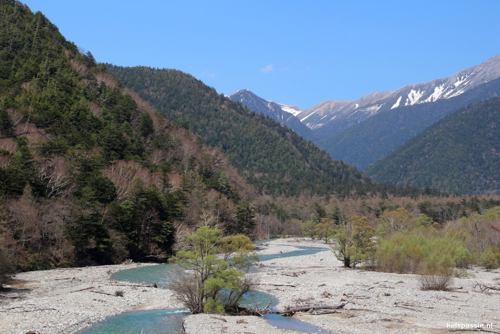 Hier vandaan vertrekt het boemeltje wat richting Kamikochi gaat. Het dient gelijk als lokaal vervoer en we stoppen minstens 10 keer onderweg. Bij de laatste halte moet er overgestapt worden op de bus. Om het ook fraai te houden in de toekomst is het park niet toegankelijk voor auto's, alleen bus en taxi rijden het laatste stuk. Het is nog een uurtje met de bus grotendeels door de ontelbare tunnels die in dit traject zitten. Als we dan even in de buitenlucht rijden ziet het er steeds fraaier uit, smalle dalen met wilde rivieren tussen de hoge bergen.
