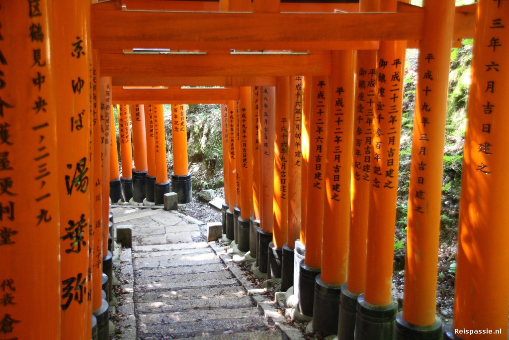Vervolgens een dag met de trein op pad binnen Kyoto. We delen het maar een beetje op, sommige bezienswaardigheden zijn het gemakkelijkst met de trein te bereiken, andere juist weer met bus of metro. Vandaag dus onze trein dag. Eerst naar de Fushimi Inari tempel. Dit is misschien wel het bekendste beeld wat er van Kyoto terug te vinden is. De tempel met de duizenden oranje poorten die als een tunnel over de paden staan. We zijn vroeg op pad gegaan maar als we aankomen is het al weer razend druk. In eerste instantie een beetje een teleurstelling want echt veel lol is er niet aan om met drommen tegelijk onder de poortjes door te gaan. Maar zoals zo vaak blijven de drommen dicht bij huis. Het eerste stuk is enorm druk, zeg maar tot het keerpunt waarbij je met een ander parallel pad weer naar beneden kunt. Maar de paden strekken zich uit over de hele heuvel waartegen de tempel is gebouwd. We lopen het rondje wat over de top gaat. Hier is het gedaan met de drukte en heb je zo nu en dan het hele pad weer voor jezelf. Prachtige uitzichten onderweg op Kyoto. Het is vandaag een warme dag maar in het bos is het heerlijk koel. En de poortjes, er staan er ontelbaar veel van. De inscripties die op elke poort staan zijn alleen zichtbaar als je afdaalt van de top. Terecht dat dit een van de toppers van Kyoto is.