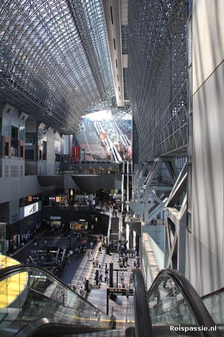 Het is een gi-gan-tisch gebouw van 12 verdiepingen hoog, aan de binnenzijde is het een geheel open ruimte met aan de zijkant roltrappen die tot boven komen. Een enorme gebogen glas-stalen constructie die het dak vormt. Het eigenlijke station zit hieronder, alles boven het station is shopping en eten. Maar wat een gebouw. We zijn een paar keer de roltrappen op geweest. Boven is een dakterras met bamboestruiken en een prachtig uitzicht, o.a. op de Kyoto Tower die er vlak naast staat. Helemaal in de nok is een ‘sky-walk’ waarbij ze de zijkanten maar hebben afgeplakt voor mensen met hoogtevrees. Bovenin vormen de trappen een groot amfitheater waarbij de treden zijn voorzien van lampen waar dan ’s avonds weer een lichtshow op is. O ja, en het is er in het stations deel soms ook HEEL druk…