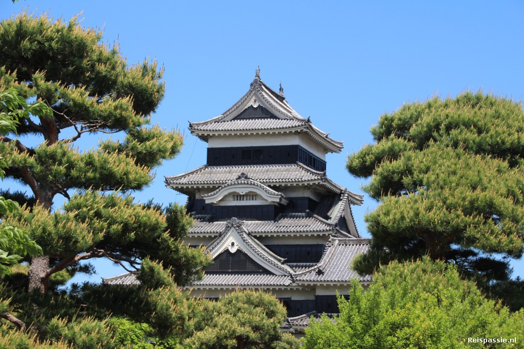 De bezienswaardigheid van Matsumoto is het kasteel uit de 15e eeuw. Het is een houten gebouw op de hoge stenen muren die omgeven worden door een slotgracht. Het kasteel is een plaatje, we beperken ons tot de buitenzijde want het bordje bij het einde van de rij voor een bezoek aan de binnenkant geeft aan dat de wachttijd minimaal twee uur is.....