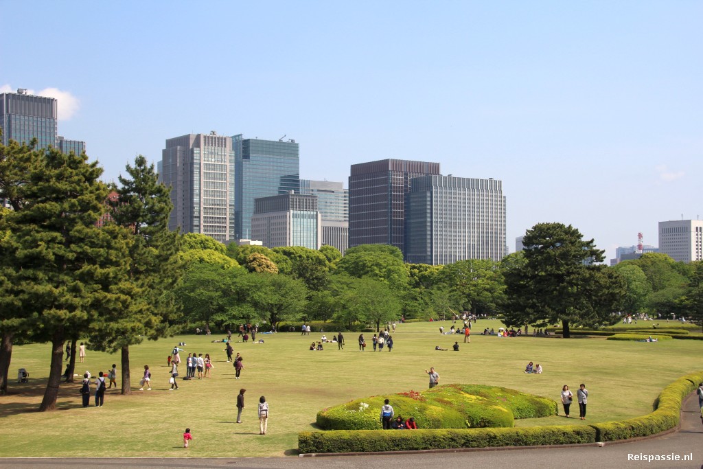 Vervolgens naar het Imperial Palace in hartje Tokyo. Of tenminste wat er van over is. De muren die het omsluiten zijn indrukwekkend, maar binnen de muren is er eigenlijk alleen nog een groot park. In het midden is een groot open veld en hier stond ooit het paleis met al z'n bijgebouwen. Nu dus gras en daar wordt met dit fraaie weer veel gebruik van gemaakt. Overal liggen mensen te relaxen. Goed voorbeeld doet goed volgen en dus liggen wij ook een uurtje te snurken tussen de gezinnetjes.