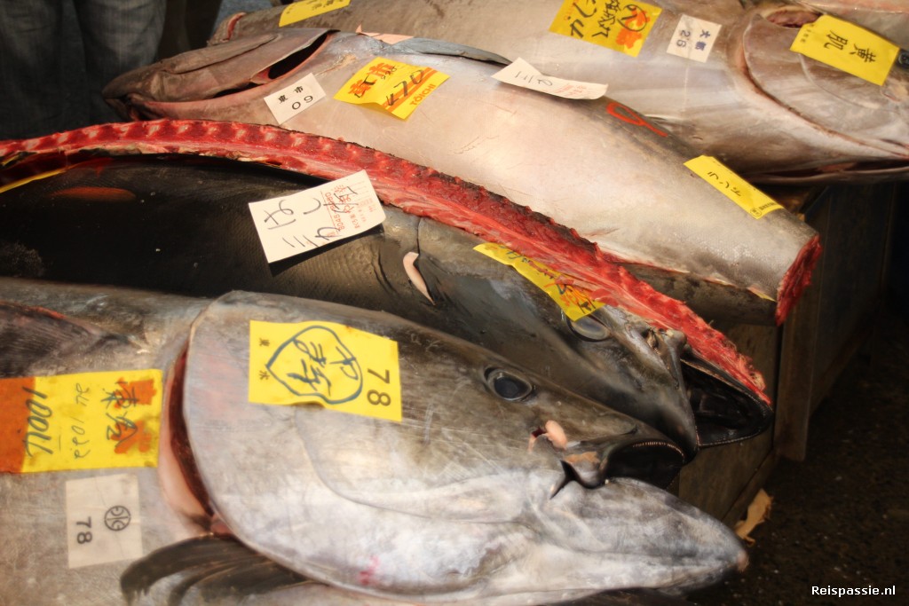 De dag er op zo vroeg mogelijk getracht richting Tsukiji vismarkt te gaan. Maar we zitten nog aardig in de jetlag dus heel vroeg werd het niet. De vismarkt begint om vijf uur 's ochtends en dat hebben we dus niet gehaald..., het werd een uur of 10. En dan zijn ze daar dus al weer een beetje aan het schoonmaken. Gelukkig valt er nog genoeg te zien. dit is de grootste vismarkt ter wereld en inderdaad het is enorm! Zoveel hallen met vis en schelpdieren. De reusachtige tonijnen waren inmiddels bijna allemaal al in mootjes gehakt. Allerlijmandere vissoorten liggen in het ijs in piepschuim bakken. Het is onmogelijk dat de natuur dit kan bijhouden, zo'n enorme hoeveelheid vis die alleen al vandaag op deze markt wordt verhandeld. Niet zo gek dat de zeeen leegraken. Al zag je er ook bakken met Noorse en Chileense kweekzalm. Overigens ook hier drommen mensen. Maar de handelaars zijn er kennelijk aan gewend want ze rossen op volle snelheid met hun karretjes door de paden.