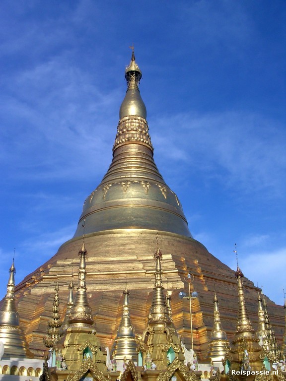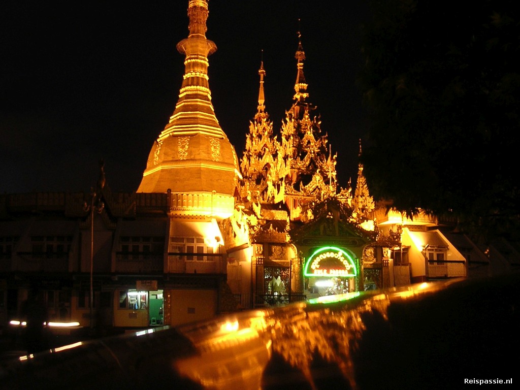 In de namiddag naar de Swedagon Paya gegaan, de grootste en meest heilige tempel van Myanmar. Het is een enorm komplex wat zelfs per lift te bereiken is. De grootste stupa is ergens tussen de 6e en 10e eeuw gebouwd. Hij is bedekt met 53 ton bladgoud ! Alle omringende gebouwen en stupa's hebben ook bladgouden dakbedekking of in elk geval een goudkleurige verf. Het is dus een heel goudkleurig geheel en het weerkaatste zonlicht geeft de omgeving een aparte kleur.