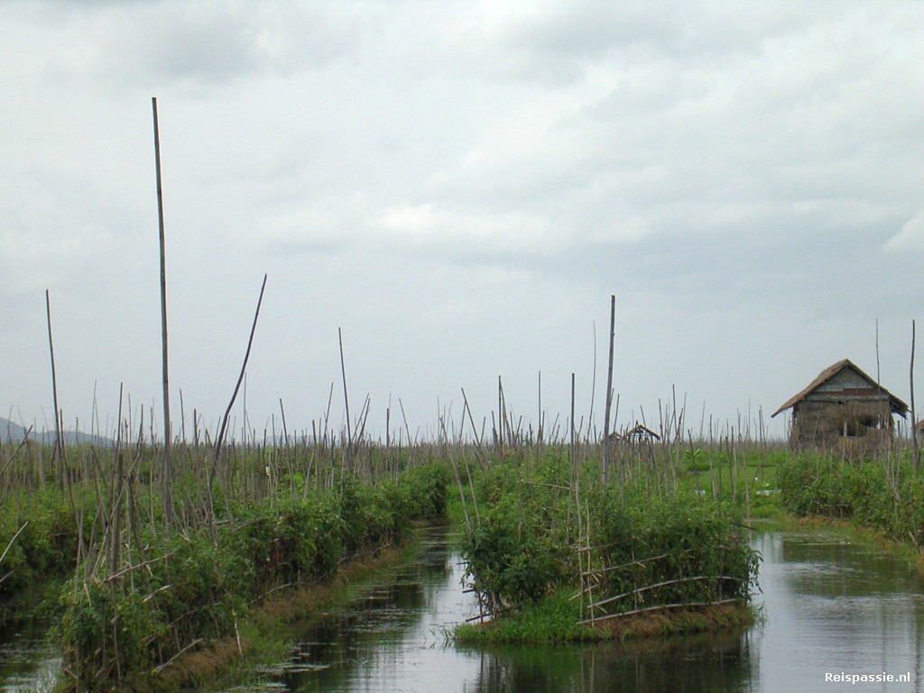 Gelukkig valt het met hete weer ook wel mee, het is nog wel bewolkt maar blijft vooralsnog droog. We varen eerst een half uurtje door een lang kanaal richting het meer. Er wordt overal gevist en met tomaten heen en weer gevaren. Het Inle lake staat bekend om z'n tomaten kwekerijen.