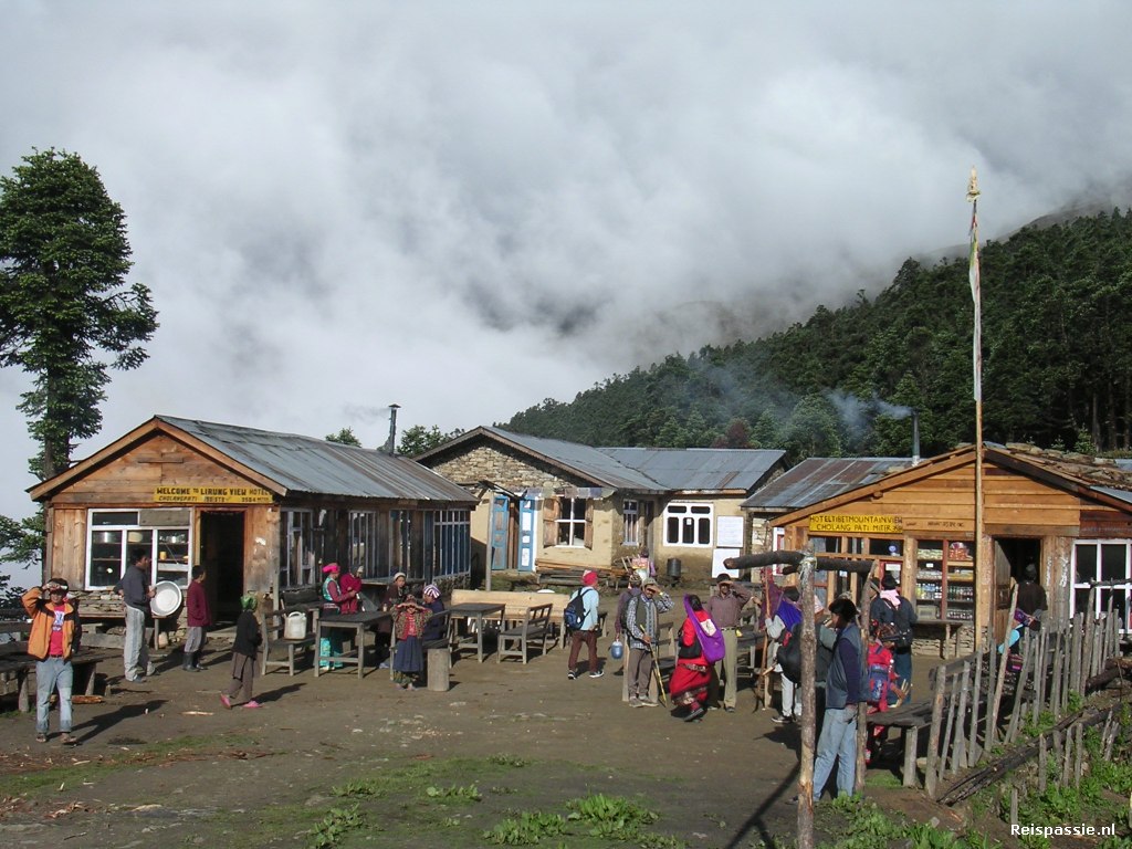 Na anderhalf uur lopen daar gearriveerd. Inmiddels op 3670 Mtr. hoogte. Hier gegeten en overnacht bij het Kiring view hotel. Later arriveert er nog een grote groep Nepali die op weg zijn naar het heilige meer bij Gosainkund. Ze blijven ook overnachten en dat geeft nogal een rumoer. Er wordt in de slaapkamers gekookt en gepraat en we slapen deze nacht dus niet echt veel.