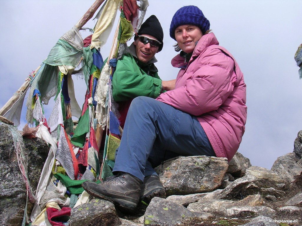 Als we op de top zijn komt de zon ook nog even door de wolken zodat het eindelijk een mooi plaatje is. Snel wat foto's gemaakt want het duurt maar even. Hierna daalt de route door een brede vallei. Een pad is er eigenlijk niet meer, het is klimmen over de enorme stenenvelden. Niet gemakkelijk en vermoeiend maar wel erg mooi. Rond de middag bij Phedi. Er staat een stupa ter nagedachtenis aan het vliegtuig van Thai Air dat hier in 1992 tegen de berg vloog. Bij het guesthouse staat een stuk uit de romp. Een beetje luguber maar vanuit het boeddhisme begrijpelijk omdat men graag laat zien hoe vergankelijk het leven is. Hier wat gegeten.