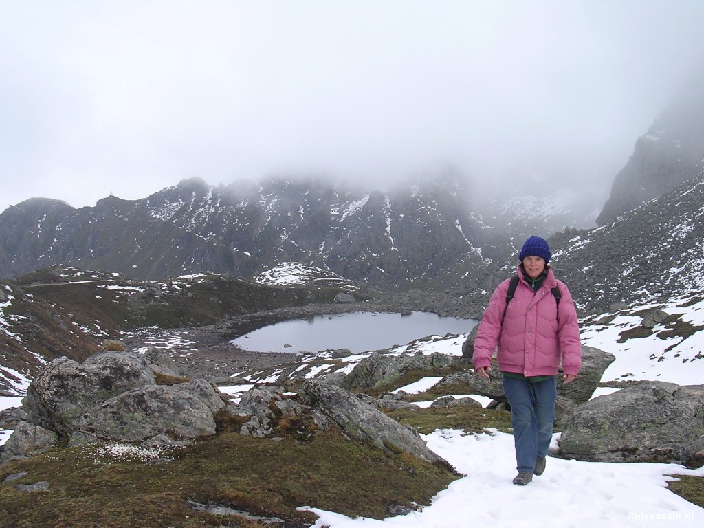 De derde dag starten we ook weer vroeg. Vannacht niet zo goed geslapen door de hoogte, verder geen problemen met de hoogte. Al voor zevenen lopen we langs de meertjes. Ze liggen er mysterieus bij in in de wolkennevel. Vandaag gaan we over het hoogste punt van de trek, een pas op 4600 meter. Er ligt hier dan ook nog aardig wat sneeuw.