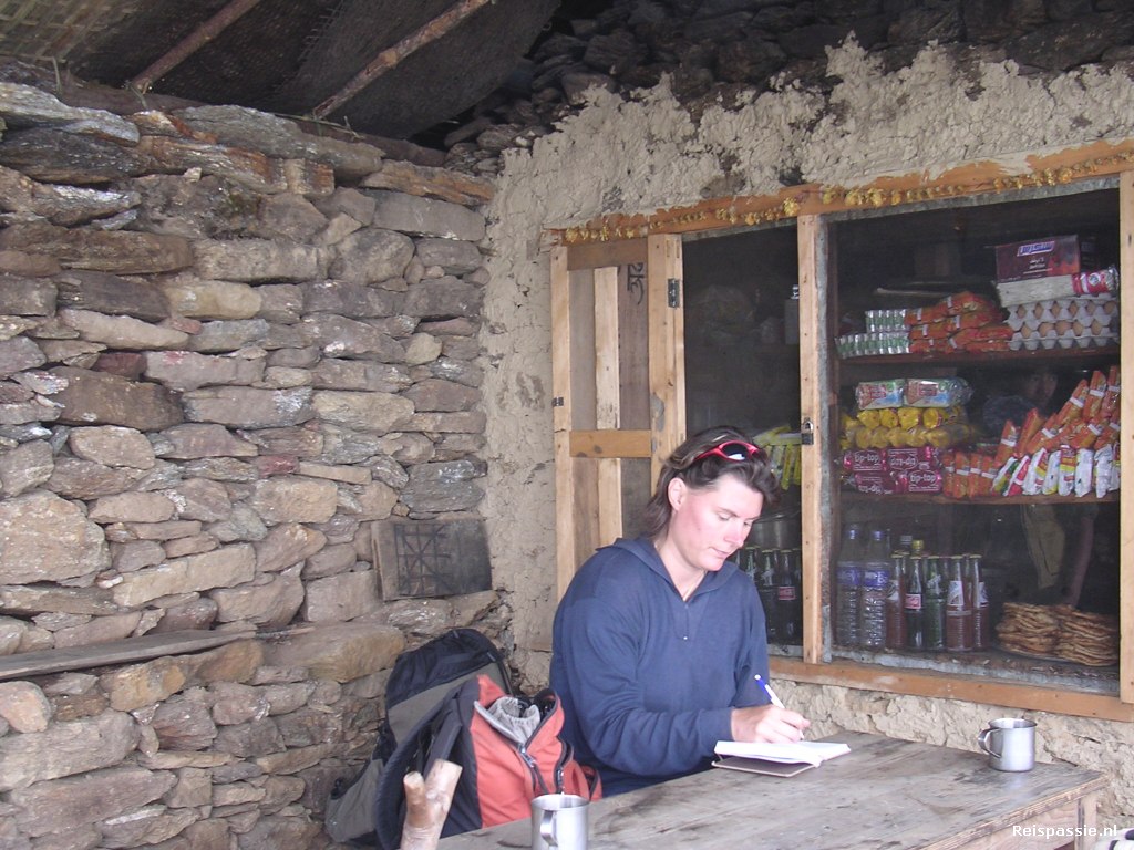 Als we weer vertrekken is het inmiddels gaan regenen. De poncho's dus aan en weer een heel stuk klimmen en dalen. De stenen zijn door de regen glad geworden wat het niet eenvoudiger maakt. Rond een uur of vier in Ghopte aangekomen. We zijn de enige gasten in guesthouse "Namaste".