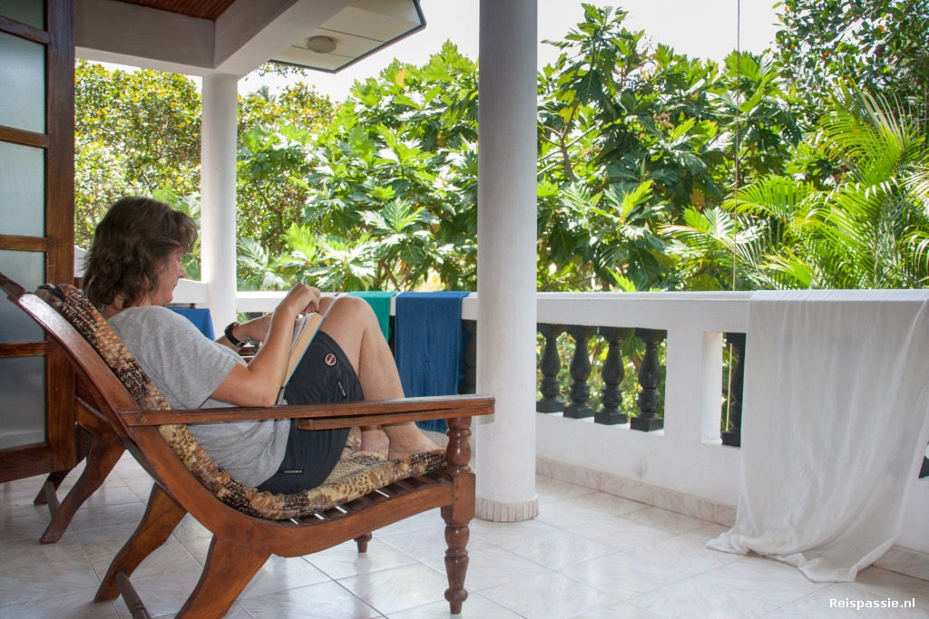 Wij vinden ons plekje een stukje landinwaarts bij “The Rock house”. Ook hier zijn we weer de enige gast. Er lopen wel aardig wat toeristen rond in Unawatuna maar er is zo veel meer accommodatie dat de prijzen heel laag zijn. Waanzinnige kamer voor een prikkie. Waarschijnlijk de grootste ooit, met mega veranda. Uitzicht op een stuk groen waar s' ochtends de apen in langskomen. Als ik wakker wordt zitten ze me vanuit de bomen aan te kijken. Vogeltjes, eekhoorns, het is weer een fantastisch plekje.