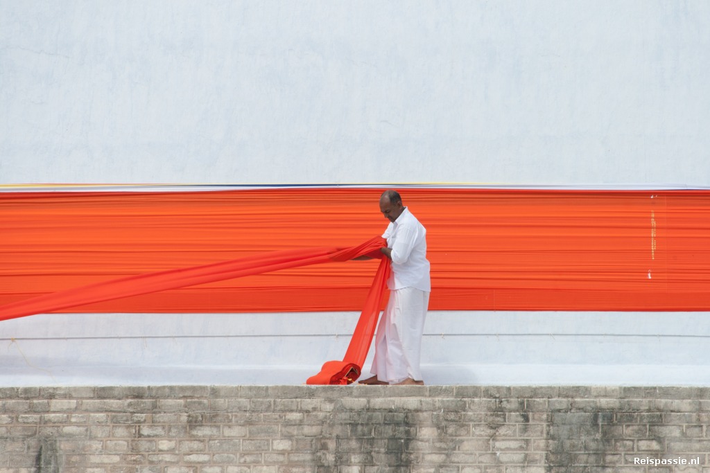 Sommige zijn heel fraai gerestaureerd en weer helemaal witgekalkt, andere zijn gewoon kale baksteen. Eentje staat er in de steigers omdat er nu hersteld wordt. Hieraan kan je mooi zien wat een enorm bouwwerk het is. Voor de lokale bevolking zijn het nog steeds heilige lekken en er wordt veel geofferd bij de Boeddhabeelden. De heiligste plek is echter de Bodhiboom. Om deze boom (of eigenlijk bomen want het zijn er meer) is een heel tempelcomplex verrezen. Er wordt hier al meer dan tweeduizend jaar continu geofferd.