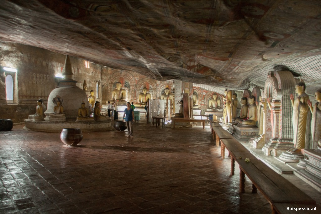 De tempels in de grot zijn gelukkig een stuk fraaier. Je moet wel eerst weer een leuk stukje traplopen maar het is de moeite. De grotten zijn geheel voorzien van rotstekeningen en staan vol met boeddha beelden waaronder een aantal liggende.