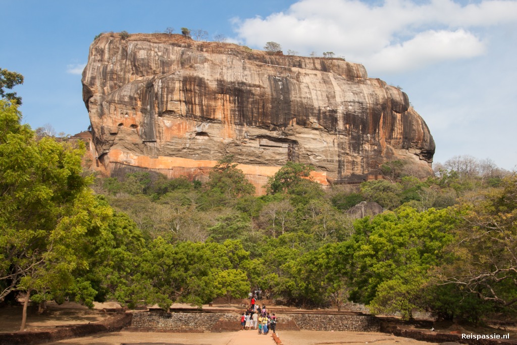 Dan naar “de rots” gegaan. Wereldberoemd in heel Sri Lanka (en daarbuiten). Hij ligt in het dorpje Sigirya een uurtje of twee met de bus vanaf Pollonaruwa. We zijn dus al voor de middag in dit fraaie kleine dorpje. Lekker rustig tussen de rijstvelden. Kamertje gevonden bij de Lakmini Lodge. De eigenaar heeft aan de achterzijde een hut op palen gebouwd van waaruit je een prachtig uitzicht op de rots hebt. Die middag eerst wezen zwemmen bij een hotel uit de wat duurdere categorie. Kost je een euro maar dan lig je ook wel lekker in het zwembad te dobberen.