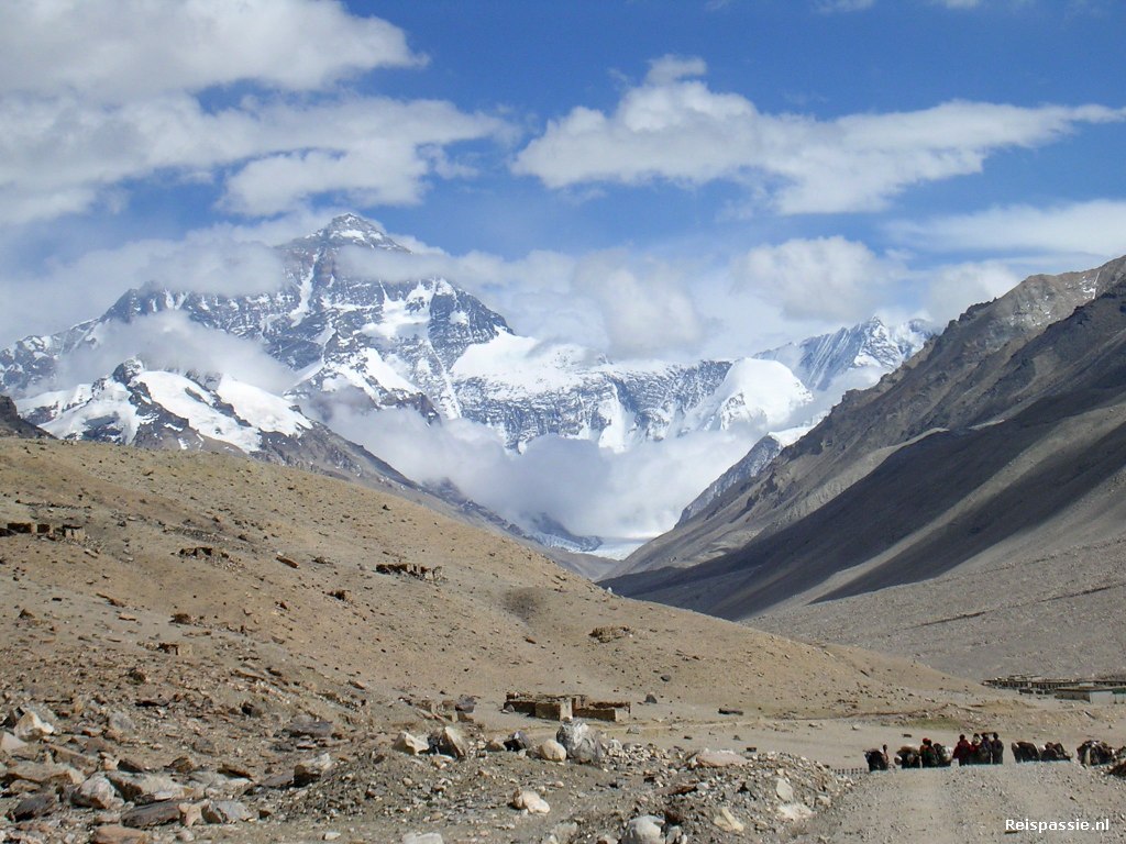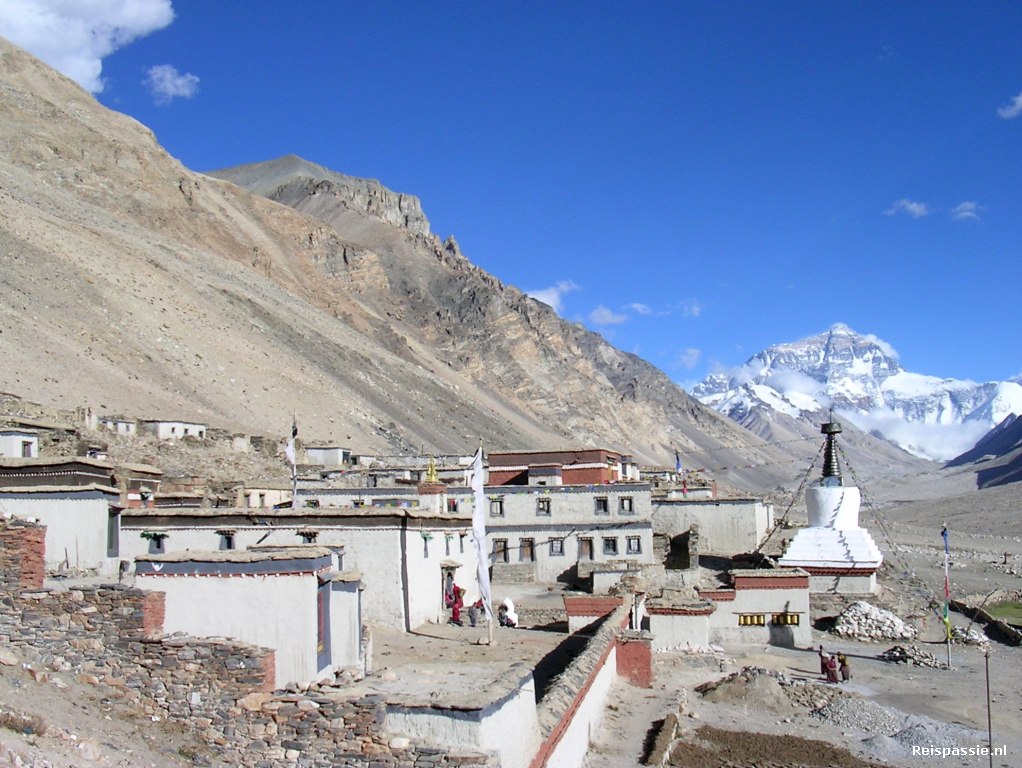Als we wakker worden openen we eerst de gordijnen van ons kamertje. En daar ligt hij dan in volle glorie; Qomolangma op z'n Tibetaans ofwel Mt. Everest. Het is weer een wolkeloze dag en de witte top steekt scherp af tegen het heldere blauw.