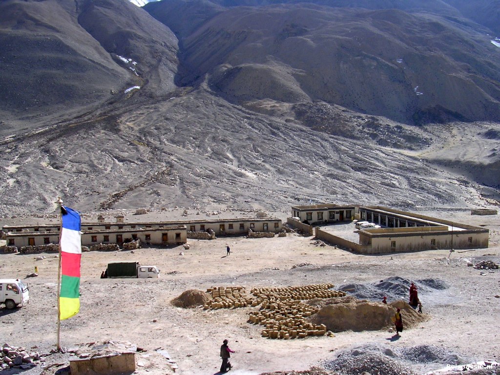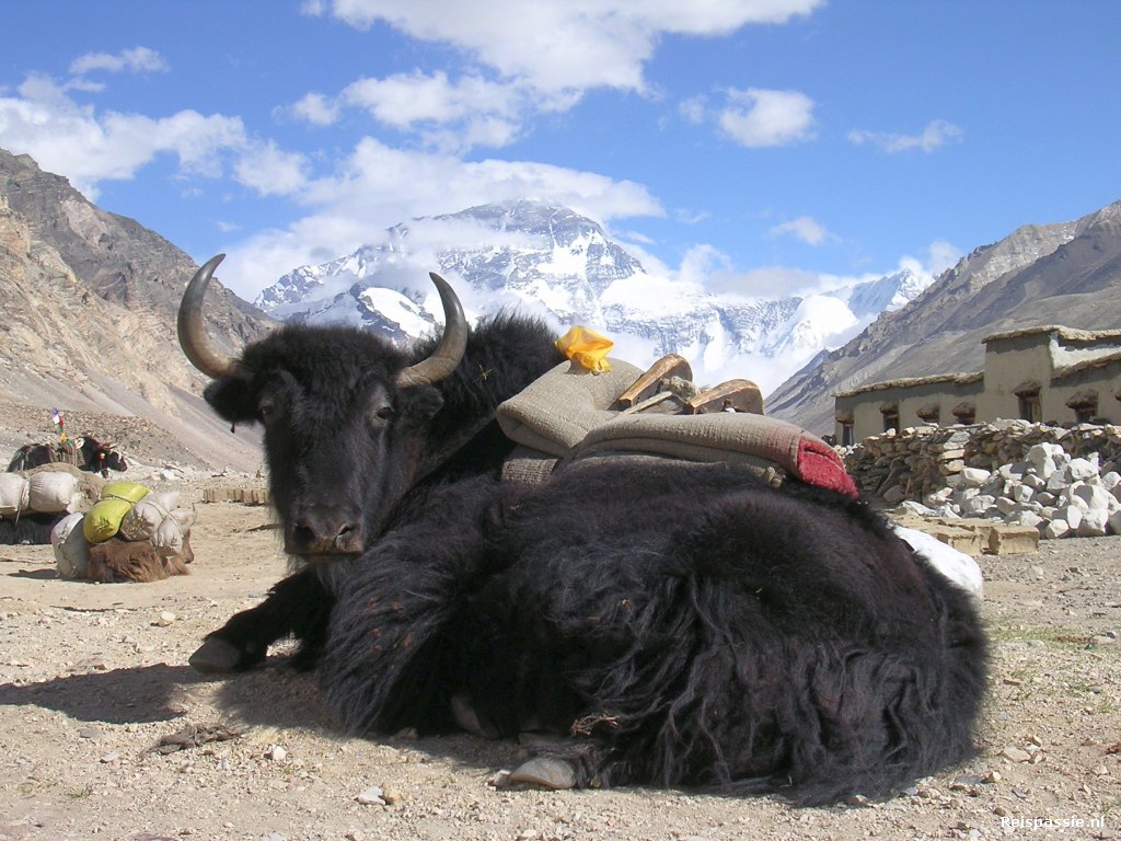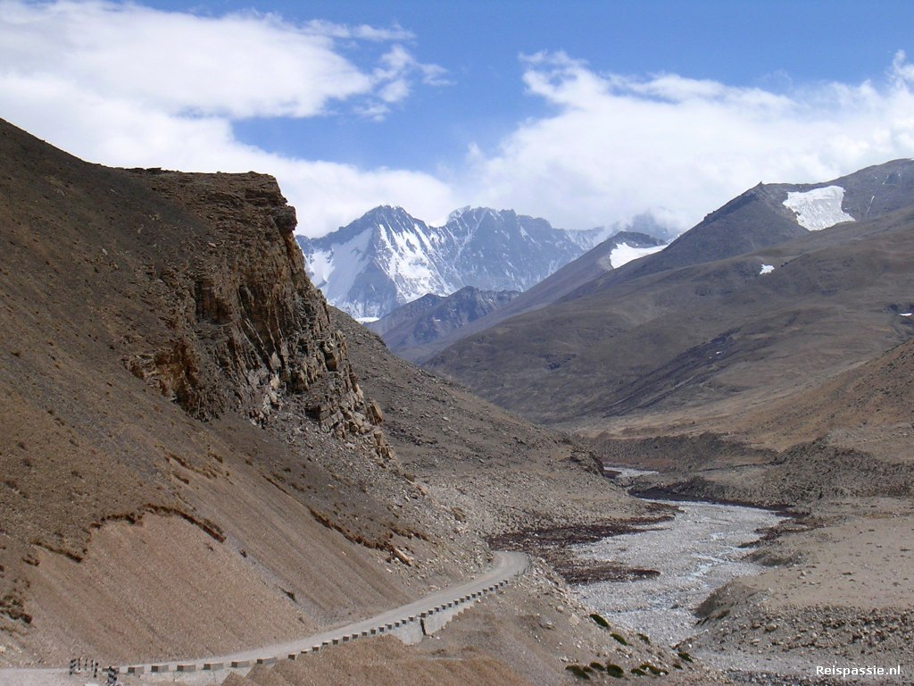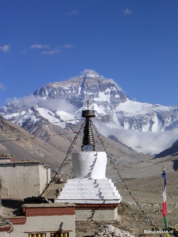 Vanaf hier is het nog drie uur rijden tot Rongbuk, de uitvalsbasis naar het Everest basecamp. Onderweg een fantastisch uitzicht vanaf de Lamma-la pas. Je ziet vanaf hier vier 8-duizenders naast elkaar; de Makarn 8163 / Lhotze 8511 / Cho oyo 8153 en natuurlijk de Everest 8848. Rondom de toppen van deze joekels hangen nog wolken waardoor we ze niet geheel kunnen zien.