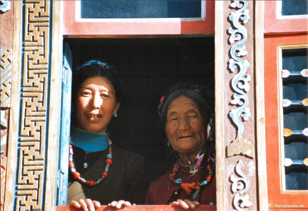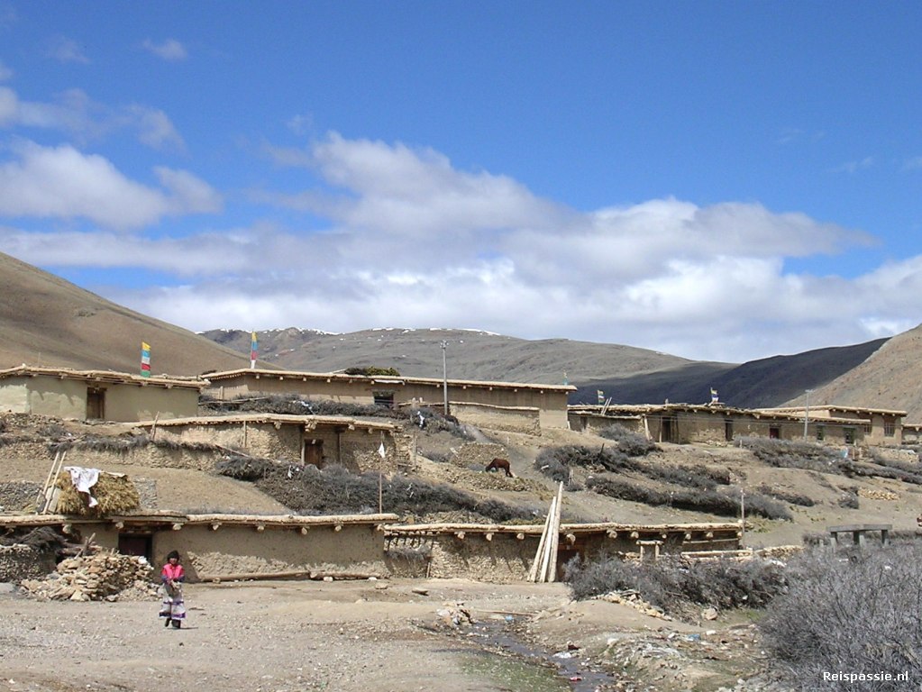 Na het bezoek aan het klooster door het dorpje gelopen. Het zijn allemaal eenvoudige lemen huizen van boeren families. Op elk huis staat wel een paal met gebedsvlaggetjes. Een wandeling door het dorpje brengt gelijk een hoop mensen op de been. Kennelijk gaat het als een lopend vuurtje dat er "vreemden" zijn. De mensen zijn heel verlegen en lijken echt voor het eerst westerlingen te zien. Bij een huisje staat een vrouw die ons graag haar huisje wil laten zien. Het is de indeling die we al eerder bij Tibetaanse huizen hebben gezien; een buitenmuur waar de verblijven tegen aan zijn gebouwd en in het midden de binnenplaats. Er scharrelen wat kalveren en biggen in het rond. De huiskamer is opgezet rond de kachel/fornuis en de grote koperen pannen staan tegen de muur opgestapeld. Het is een klein en knus onderkomen.