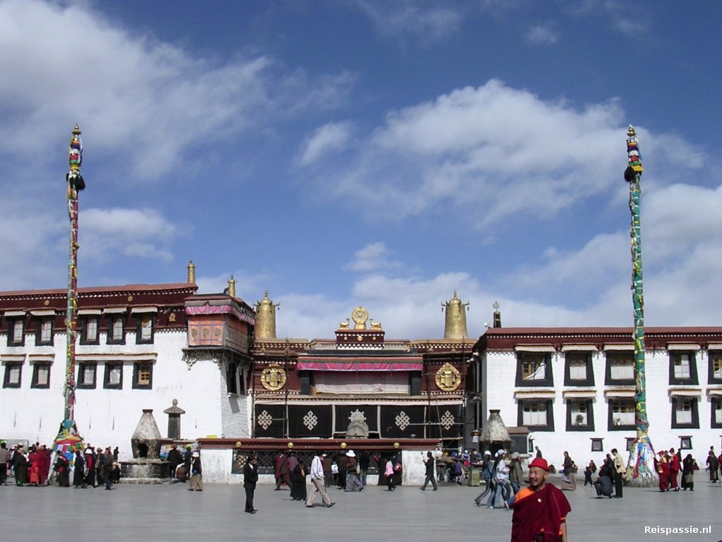 De derde dag in Lhasa hebben we de Jokhang tempel bezocht. Dit is een van de heiligste plekken van Tibet. Uit het hele land komen pelgrims naar Lhasa om deze tempel te bezoeken. In de oude stad lig rondom het Jokhang de zogenaamde kora. Dit is de route die de pelgrims uren achter elkaar lopen terwijl ze hun gebeden prevelen en gebedsmolens draaien. We hebben het rondje van wat meer dan een kilometer ook een aantal maal gelopen. Het is een bijzondere ervaring. De mensen lopen soms bijna in trance over de kora die aan beide zijdes voorzien is van een lang lint winkels, kraampjes en straatverkopers die alles te koop hebben wat een Tibetaan hier (of thuis) nodig heeft. Gebedsvlaggen, bontmutsen, hoefijzers, gebedssnoeren, beelden, schoenen, yakboter en nog veel meer. En hierbij ook nog eens heel veel "antiek", sierraden, boeddhabeeldjes en dergelijke zodat het ook voor ons erg leuk shoppen is.