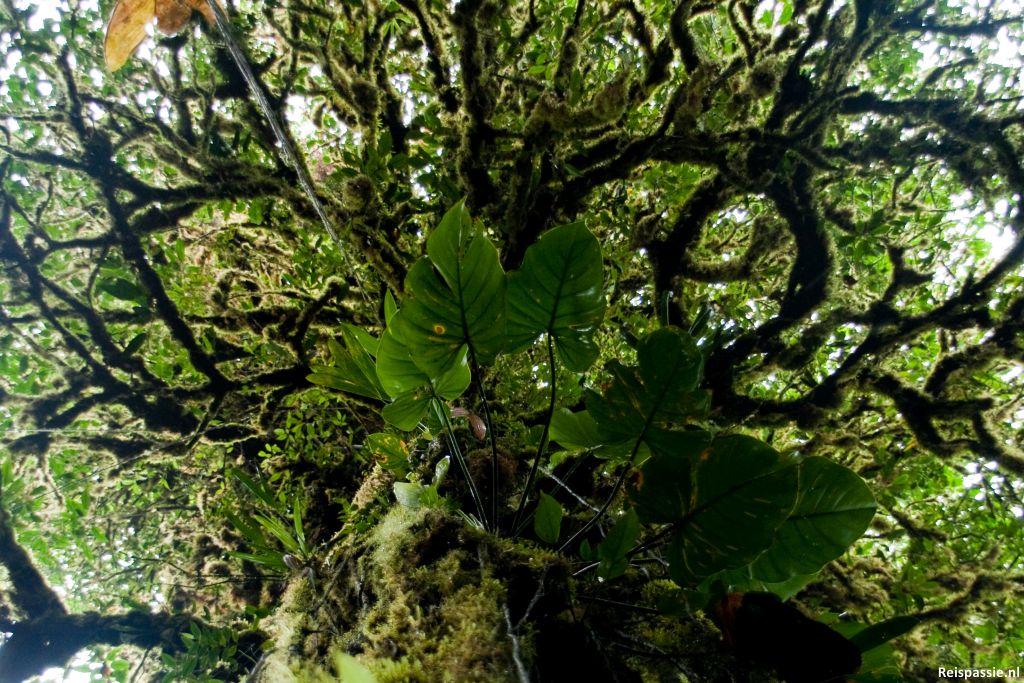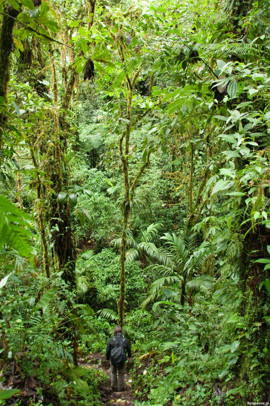 In het park zijn verschillende routes uitgezet die je kan lopen. We kiezen de twee langste en zijn zo een uur of vier aan de wandel. Het nevelwoud is prachtig. Door de enorme luchtvochtigheid en de wolken die continue aanwezig zijn hangt het vol met mossen en varens. De bomen zijn er geheel mee bedekt. Het nevelige maakt dat het een mooi mysterieus sfeertje heeft. Gelukkig hebben we vanochtend onze jassen aangedaan want het is wel behoorlijk fris, 14 graden, 100% luchtvochtigheid en soms harde wind, dan kan je wel een jas gebruiken!