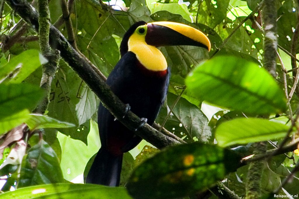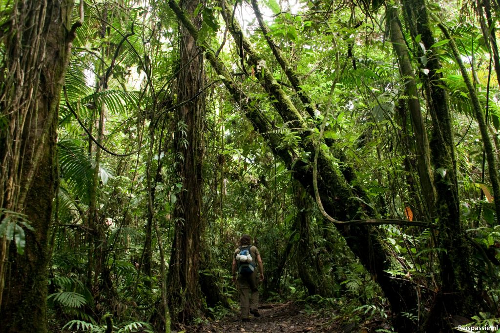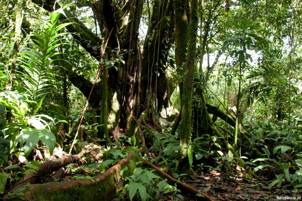 Een warm stuk want de zon staat er flink op te branden. Daarna het regenwoud in. Gelijk een stuk koeler, maar wel weer lekker vochtig. Dit deel van de wandeling is echt prachtig. Zo veel soorten planten en bomen, en zo nu en dan nog prachtige bloemen ook. Het is geregeld wel sjokken door de blubber. Halverwege hebben we enorm geluk. Een aantal toekans zit te eten in de bomen vlak bij ons. Ze zien er schitterend uit, gele nek en die enorme snavel. Heel wat foto's geschoten. Al te langs stil staan wordt echter wel afgestraft want de muggen grijpen gelijk hun kans.
