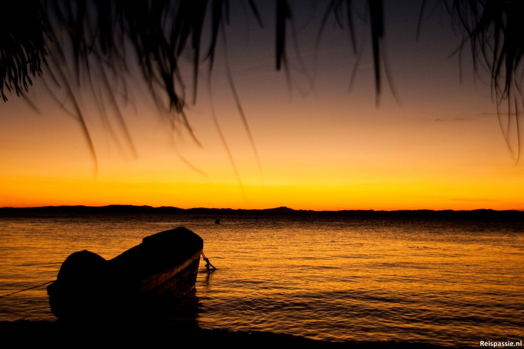 Ook hier waait het nog hard en de waterstand van het meer is zo aan het eind van het regenseizoen erg hoog. Gevolg, de golven beuken over de pier naar de boot heen. Het is rennen om droog over te komen. Het is een ferrybootje van niks, dat wordt hossen zo dadelijk op het meer. Maar El Che staat op de brug geschilderd dus we hebben een beschermengel! Voor de zekerheid maar wel even een reispilletje genomen. En een mooie overtocht wordt het. Staan is bijna onmogelijk door het dansen van de boot, dus we blijven maar zitten. Het is overigens wel prachtig helder weer en Isla Ometepe ligt te schitteren in het avondlicht. Het eiland wordt gevormd door twee vulkanen; de Maderas (1394 m) en de Conception (1610m). De laatste is nog actief en heeft een fraai rookpluimpje boven de prachtige kegelvorm staan. Schitterend plaatje tegen de helderblauwe lucht.