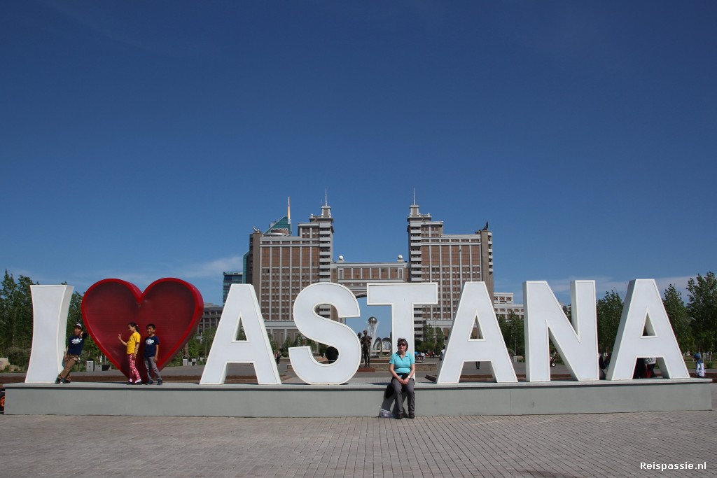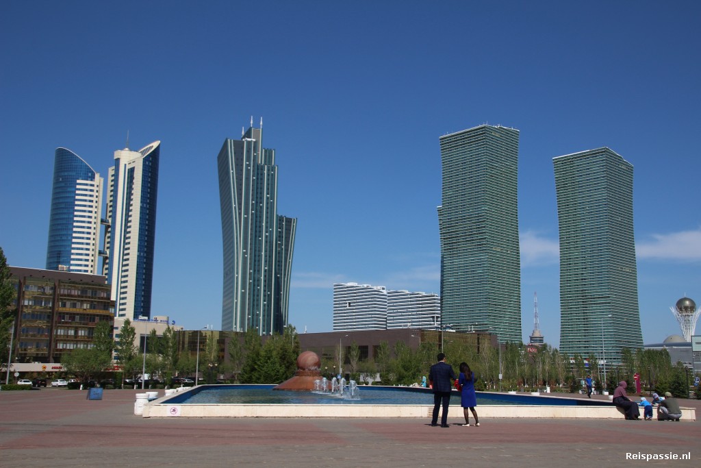 Maar rond een uur of elf zijn we weer fris en fruitig en is het tijd om de stad in te gaan. Astana is een moderne stad. Het grootte gedeelte is in de afgelopen 20 jaar uit de grond gestampt. En daarbij hebben ze alle ruimte genomen want die is er tenslotte genoeg hier op de steppe. En dus is alles even ruim. Brede wegen, minimaal vierbaans, met groenstroken en voetpaden door heel de stad. En heel veel gebouwen die al even groot en opvallend zijn. Architectonische hoogstandjes met veel glas. Een soort Dubai in de steppe.