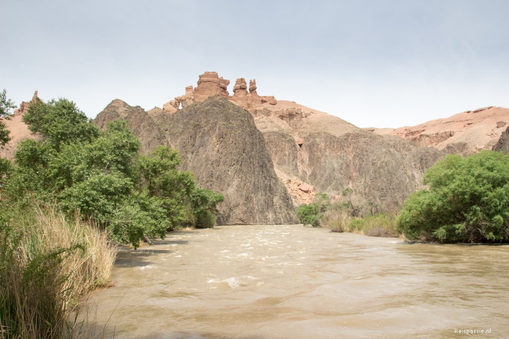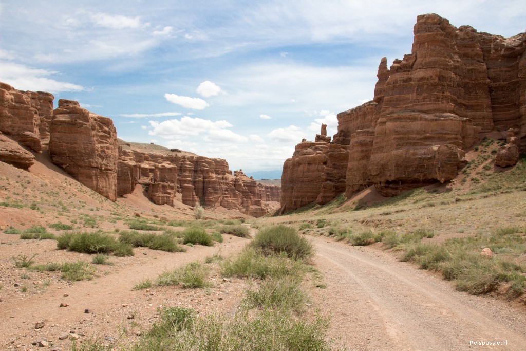 En dan keert de ruimte terug en rijden we over de steppe. Eindeloze vergezichten met wat heuvels en groepjes paarden. Na een uur of drie komt de afslag naar de Charyn Canyon. De weg naar de canyon is onverhard en Sergei gaat eens even lekker los. We vliegen over de hobbels en ribbels. Opeens staat er een slagboom met huisje in de vlakte en zijn we bij de toegang aangekomen. Entree betaald met nog wat extra om ook door de canyon zelf te mogen rijden. En dan op pad. Om in de canyon te komen moet je een heel steil stuk af met enorme gaten. Maar het gaat goed, blij dat we hier niet tegenop hoeven zeggen we nog…