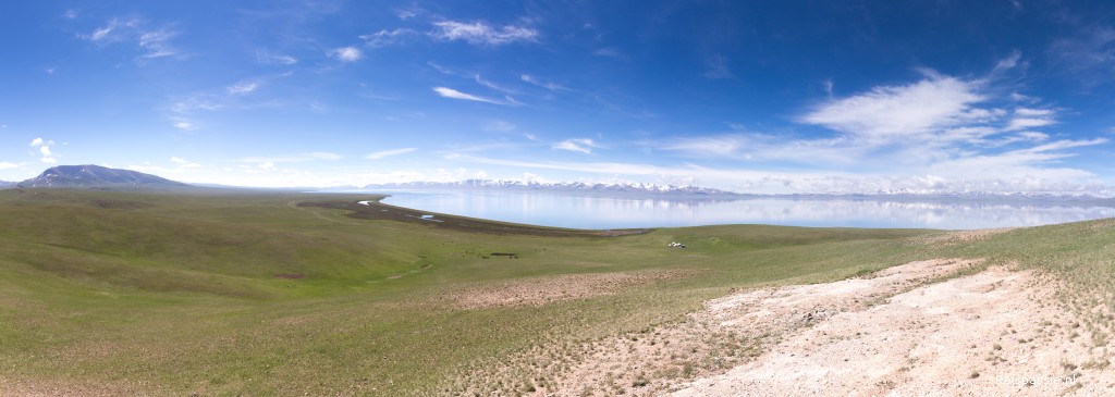 En dan staan we opeens boven. Even wat foto’s en dan weer snel de auto in want het is er bokkoud. Vervolgens weer wat afdalen richting meer. De eerste glinsteringen van het blauwe meer komen tussen de berghellingen door. Het is nu een klein stukje nog door de bergen en we rijden op de grasvlaktes die Son Kul omringen. Het Son Kul meer ligt op 3000 meter hoogte en in de zomermaanden trekken de mensen met hun vee uit de droge dalen naar deze vruchtbare omgeving. En men zet dan kleine kampjes met yurts op, waarbij sommigen ook wat extra yurts plaatsen om te verhuren als slaapplaats aan reizigers.