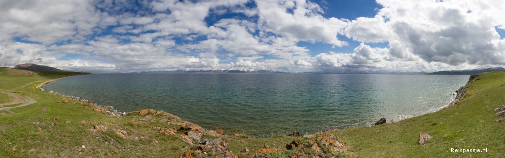 De volgende ochtend is het nog steeds helemaal helder en het is compleet windstil. Een heerlijke dag. We leggen wat kleden voor de yurt om op te lezen en ik ga op pad om de omliggende heuvels te beklimmen voor mooie foto’s van de omgeving. Het is echt subliem weer en de omgeving is zo fraai. Het blauwe meer met de enorme groene vlaktes er om heen en de bergen met hun witte toppen op de achtergrond. En weer ontzetten veel plantjes met kleine bloemen. Hele weides kleuren geel, wit of roze. Terug bij de waterkant maken we er nog wat foto’s van het spiegeltje wat het meer nu is. Enorme scholen kleine visjes zwemmen vlak langs de kant voorbij.