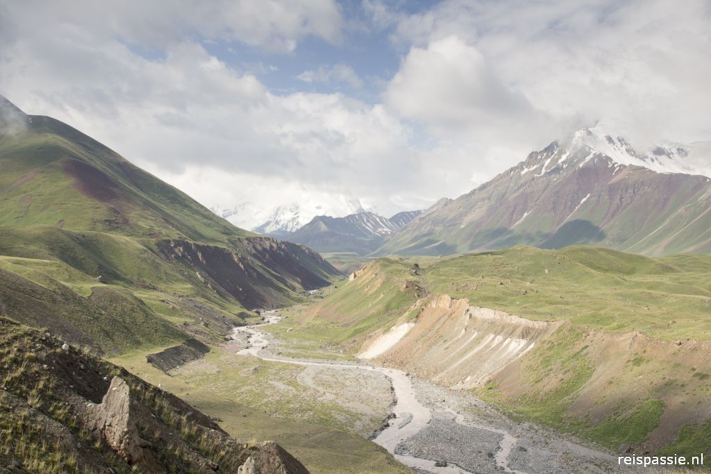 Die avond vroeg naar bed en hopen op mooier weer de volgende dag. Maar helaas, de nieuwe dag is net zo grijs als de vorige. Af en toe valt er een gaatje en we zien de enorme sneeuwhelling van Lenin peak even tussen de wolken door. Maar het heeft wat ons betreft geen zin om nu de bergen in te trekken naar het uitzichtpunt want de kans dat je niets gaat zien is wel erg groot.