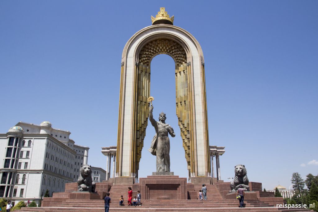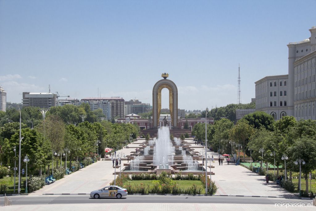 De volgende dag de highlights in de stad langs. Het is wederom erg warm dus we pakken maar even een bus richting centrum. Eerst naar het standbeeld van Ismoil Somoni, de vader van de natie. Hij staat voor een enorme boog met een kroon er op. Je mag niet al te dichtbij komen, er komt al snel een mannetje met enorme pet vertellen dat we moeten wieberen. Vanaf hier gelopen langs een enorme reeks fonteinen naar een monument aan de andere kant van deze wandelavenue. Het is niet erg druk hier, zal wel door de warmte komen. Zo lopen we eigenlijk de hele ochtend door een parkachtige omgeving en pakken ook nog even het presidentiële paleis en standbeeld van Rudaki mee. Heel aangenaam groen centrum heeft Dushanbe. Vroeg gaan lunchen in een restaurant in een enorm open gebouw. Je zit hier prima ondanks de warmte. Weer eens lekker aan de laghman!