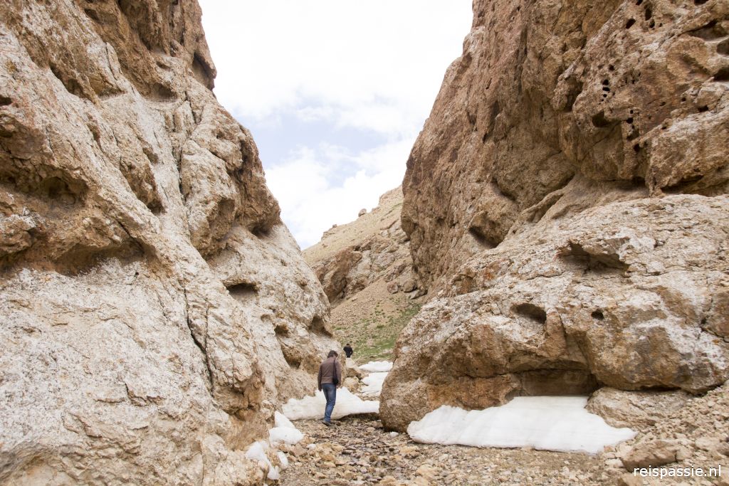 We kijken ook nog steeds uit naar Marco Polo schapen en ibexen. Turat neemt een vallei waarvan hij weet dat er heel weinig verkeer doorheen gaat. Een understatement op een plek waar je op een dag hoogstens een paar auto’s tegenkomt. Maar toch, een auto is voldoende om ze hoog de bergen in te jagen. En wij hebben geluk. Een groepje Marco Polo schapen rent de berg op als wij naderen. Dit is vlak bij een heel smalle kloof die door de heren ‘The Restaurant’ wordt genoemd. Dit omdat het wild hier zo vaak komt drinken uit het beekje en grazen van het sappige gras wat in de kloof groeit.