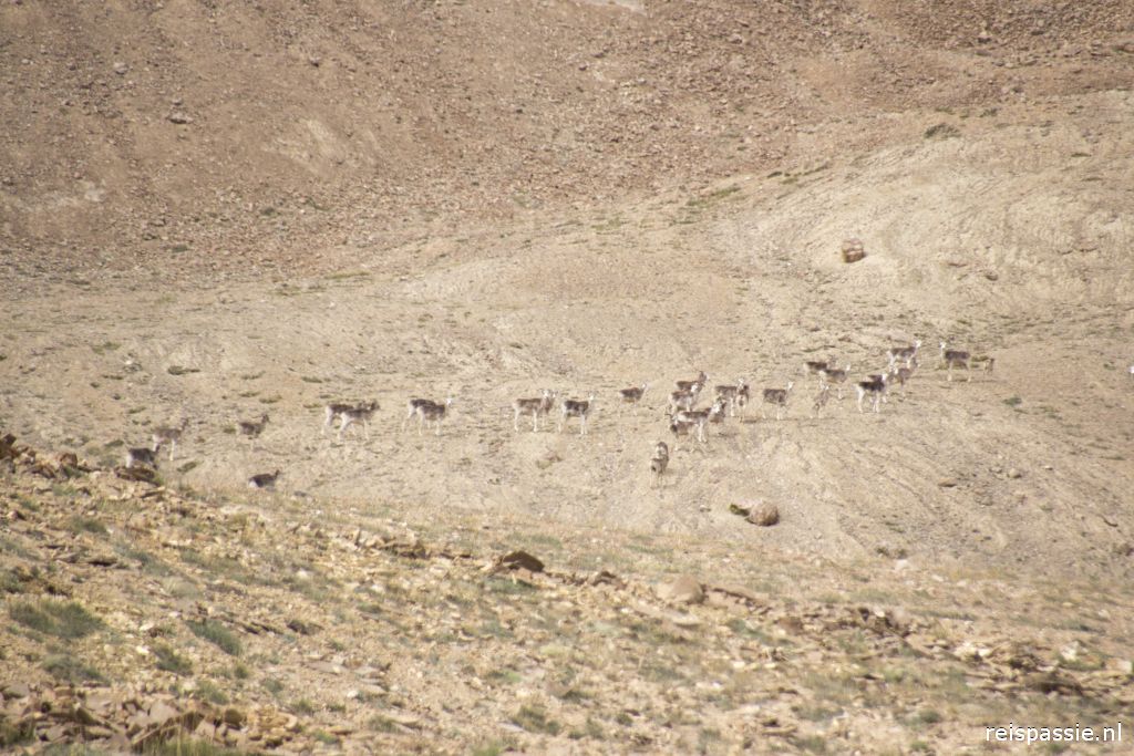 Norik weet dat ze dan vaak in de omgeving blijven rondhangen dus we gaan gezamenlijk door de kloof en vervolgens een berg aan de achterzijde op. En inderdaad, een enorme groep Marco Polo schapen loopt op een bergwand aan de overzijde. Hoewel nog op afstand zijn ze nu toch prima te zien. Het zijn er zeker een stuk of veertig en er lopen ook enkele ibexen tussen.