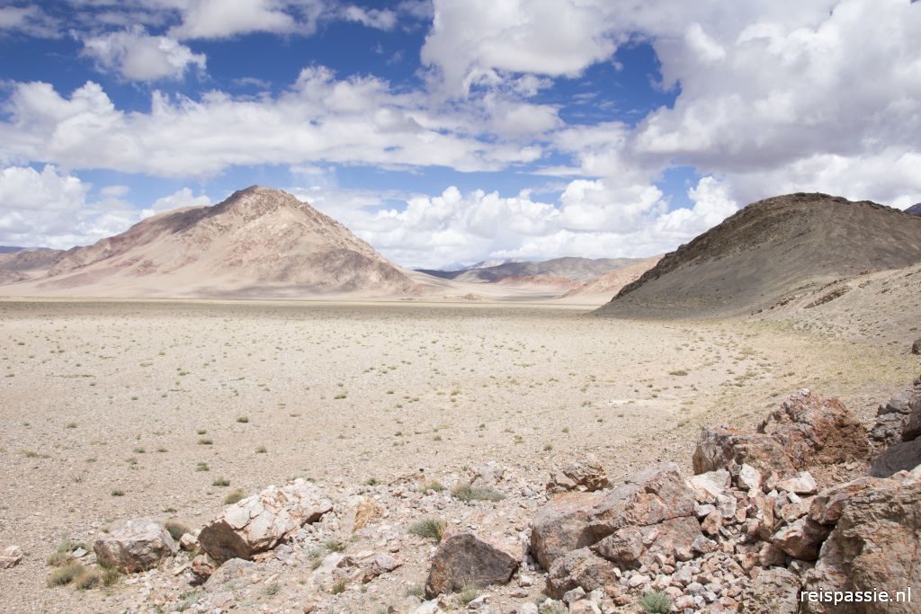 Daarna de vallei in. Het eerste half uur is niet heel bijzonder maar dan wordt het weer heel fraai. De bergwanden hebben ook hier weer een heel palet van kleuren. Ze liggen te schitteren in het ochtendzonnetje. We rijden weer een prachtig 4wd pad ls we een yurtkampje tegenkomen. Turat geeft aan de mensen daar aan dat we er graag zouden willen lunchen zodat zij zich kunnen voorbereiden en wij verder de vallei ingaan. We rijden nog dik een uur verder tot we eigenlijk niet meer verder kunnen. Dit is een prachtige plek. Een riviertje raast met veel kabaal door de verder doodstille omgeving. Ht is hier heel groen en er groeien allerlei mooie bloeiende planten. Wat een contrast met de verder gortdroge onherbergzame omgeving. Hier een beetje rondgewandeld en dan weer retour hetzelfde pad naar het yurtkampje.