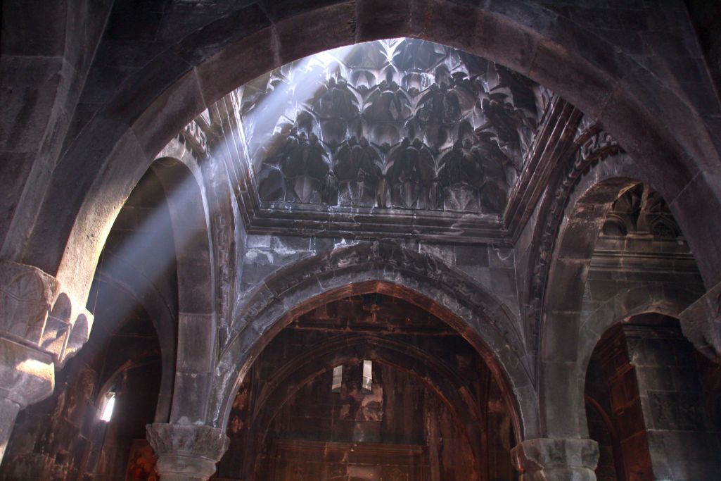 Garni is een Griekse tempel aan de rand van een kloof. Prachtige locatie. De tempel zelf stelt niet zo heel veel voor. Het Geghard klooster is veel bijzonderder. Het is vrijwel geheel uit de rotsen uitgehouwen en ook al enorm oud. In een van de ruimtes komt water uit de muur en vult iedereen weer zijn flesje. Het zou geneeskrachtig zijn. Beide plekken zijn wel enorm druk bezocht. Busladingen toeristen schuiven door de kleine ruimtes en dat doet toch een beetje af aan de speciale sfeer. Eigenlijk zou je dit ‘s ochtends vroeg moeten bezoeken voor alle drukte uit.