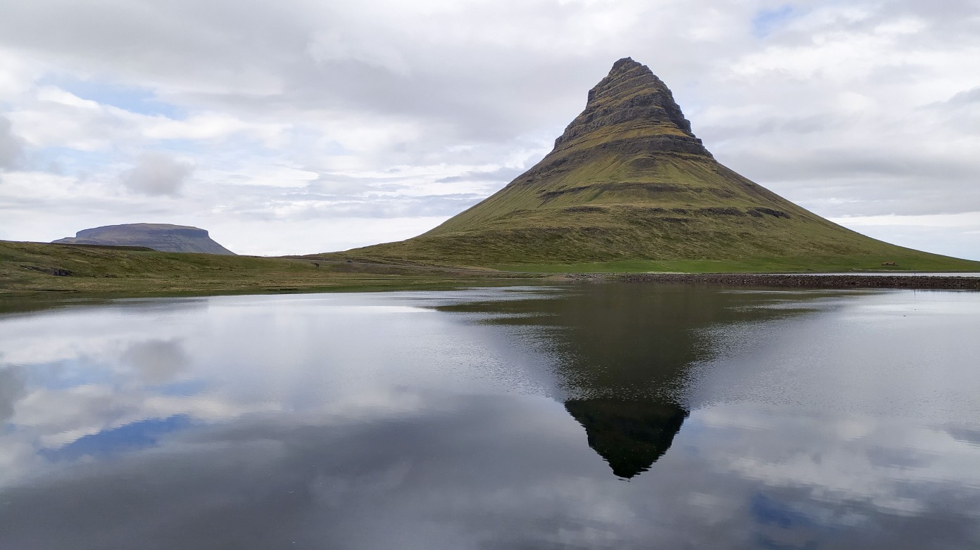 Aan het eind van de dag gaan lopen naar de Kirkjufell berg. Deze ligt hier voor de kust en heeft een heel aparte vorm. Aan de voet is een waterval en je kan een mooi plaatje schieten van de waterval met de berg op de achtergrond. Jammer genoeg hangen er als wij er zijn dikke wolken en is het erg grijs. Maar de waterval geeft er gelukkig nog wat kleur aan.