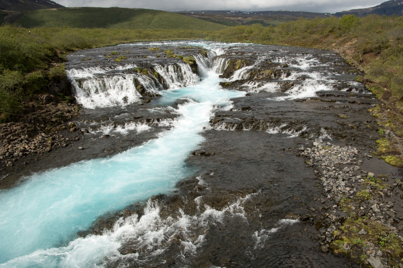 Bij de Bruarfoss waterval gestopt. Eerst weer drie kilometer hobbelen over een gravelweg om uiteindelijk te komen op een overvolle parkeerplaats. Ja, het is druk in de Gouden Cirkel, ook in Mei. De parkeerplaats is weer betaald parkeren, dus de Parka app komt weer van pas.