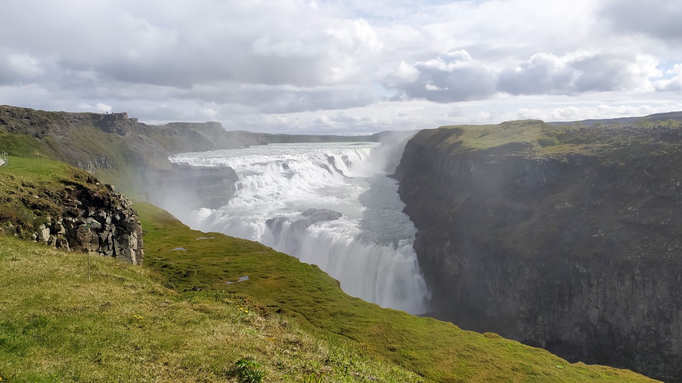 Dus vrij snel weer door naar de volgende Golden Circle klapper; de waterval van Gullfoss. Ook hier zijn we lekker voor de drukte uit. Het is een enorm grote waterval die op twee niveaus haaks op elkaar naar beneden komt. En dat geeft ook een enorme wolk waterdamp. Eerst is het nog erg bewolkt als we er foto’s gaan nemen, maar na een kop koffie in het bussie is de lucht gebroken en staat de zon op het watergeweld. Indrukwekkende plek.