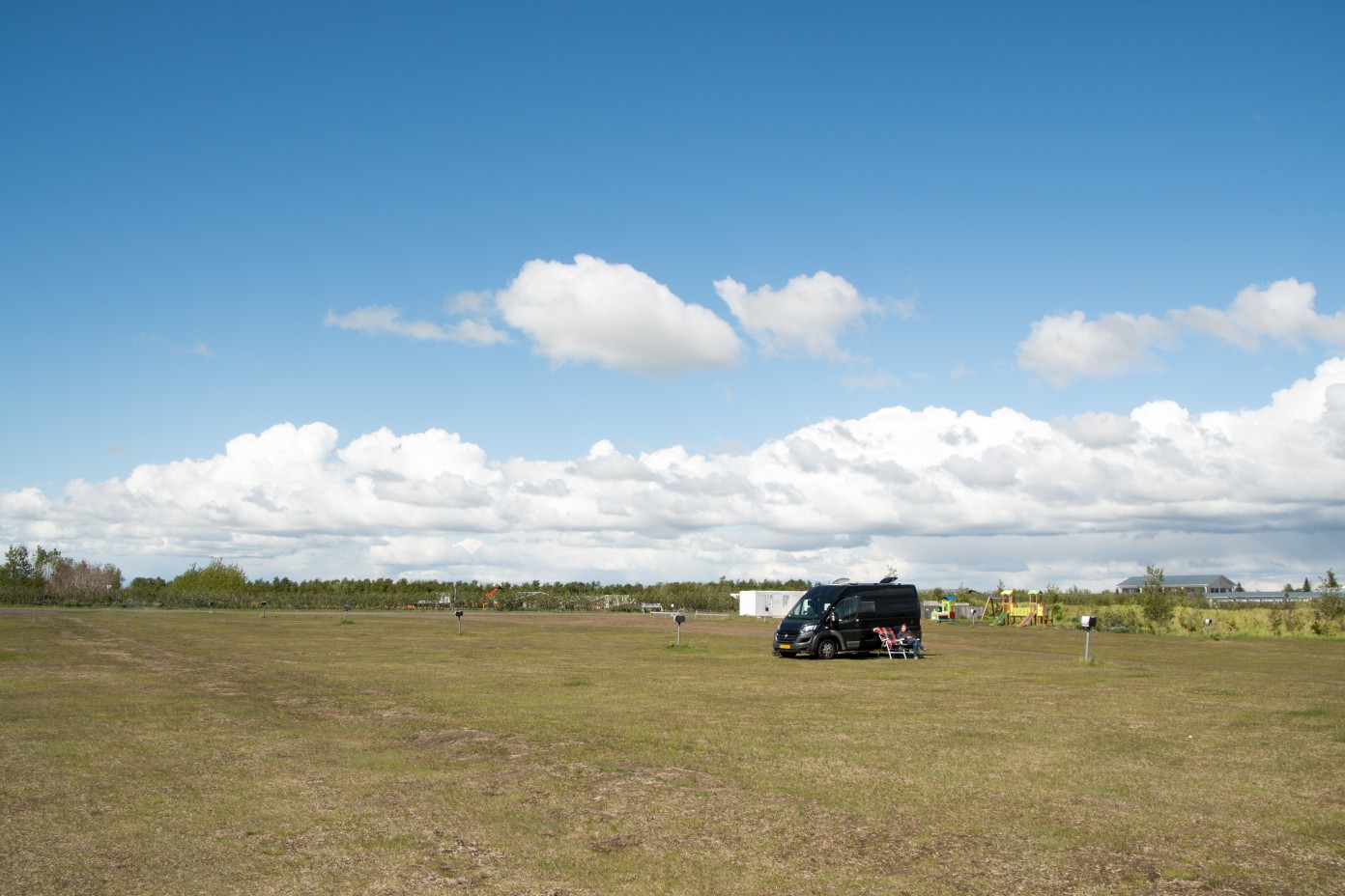 Dan doorgereden tot Hella. Hier op de camping gaan staan. Een groot vierkant veld. Maar wel met de rest van de dag heerlijk weer. We kunnen gewoon weer eens even buiten in de stoeltjes zitten. Aan het eind van de dag een rondje gaan lopen. Er loopt hier vlakbij een rivier en ook daar is, wederom, een waterval. Wel een mooi plekje om even lekker in het gras te zitten. Langs de rivier teruggelopen. De waterkant staat vol met bossen gele dotterbloemen en even hoger op de oever ziet het paars van de lupines. In het water zwemmen kleine stellopertjes die als eenden heel snel heen en weer schieten in het water op zoek naar eetbaars. Nog even staan kijken bij een paardensport evenement wat naast de camping aan de gang is en dan is het rondje compleet.