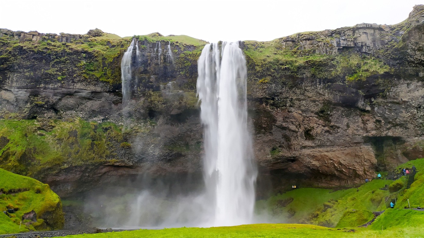 Vanuit Hella begonnen aan weer een een rondje watervallen. Een paar hele bekende, en op de route voor veel mensen dus we zijn niet de enige die een kijkje gaan nemen. Eerst naar de Seljalandsfoss, een grote waterval waar je achterlangs kan lopen. Massa’s mensen hijsen zich op de parkeerplaats gelijk in regenpak want hier kan je achter de waterval langs lopen.