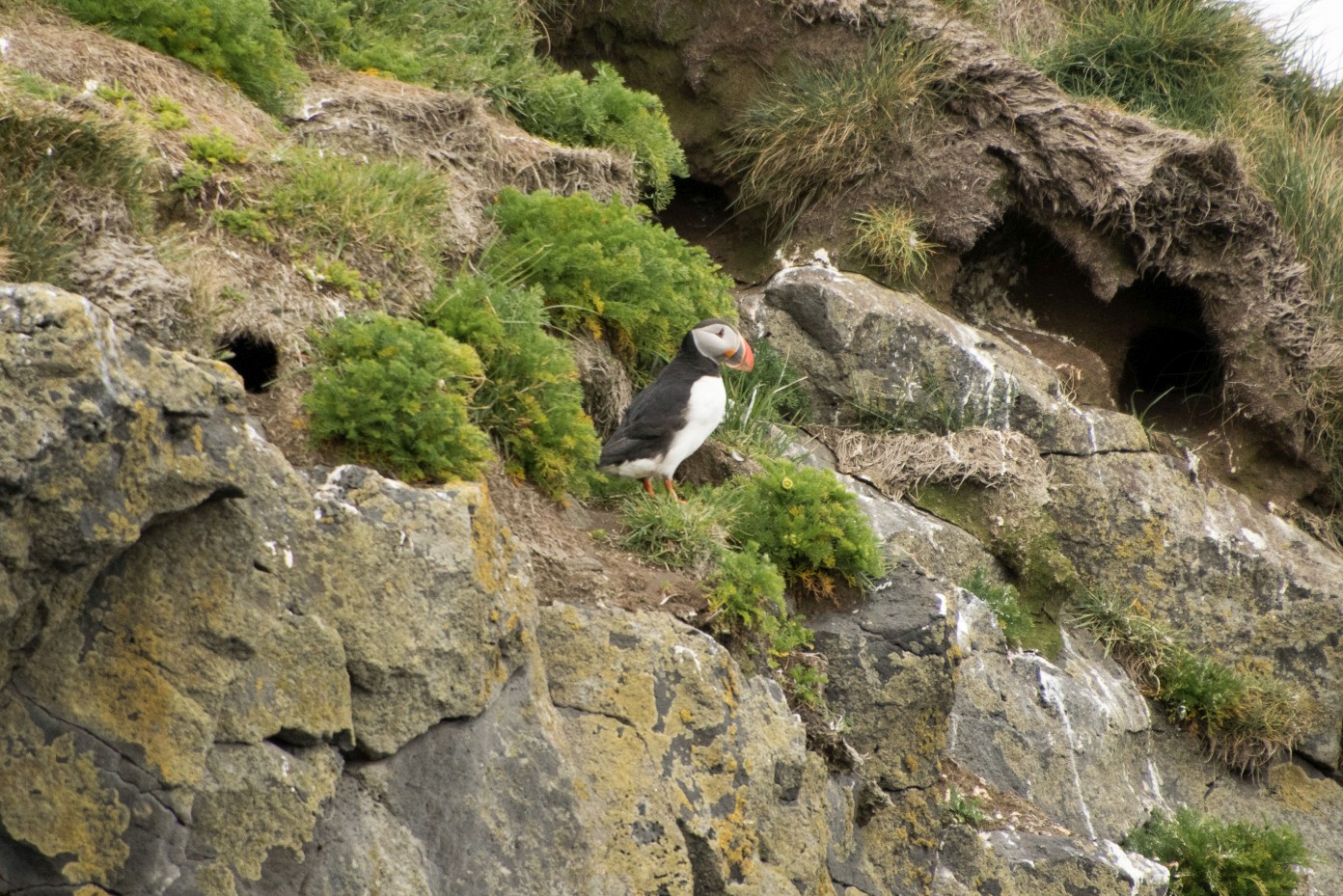 Onderweg nog een turfhuisje met uitgehakte grot bekeken en daarna naar Dyrholaey aan de kust voor kliffen en rotsen in het water met mooie vormen en we hebben mazzel want er laten zich ook nog even twee papegaaiduikers zien. Normaal zitten ze deze periode overdag op zee en komen ze pas in de vond naar hun holletjes. Deze twee kwamen kennelijk tussendoor even langs.