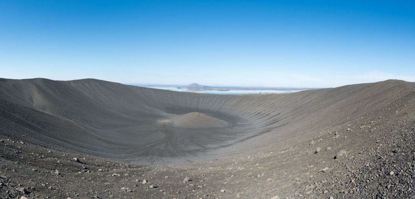Vanaf de parkeerplaats beginnen we de beklimming omhoog. Er waren nog slechts een paar andere auto’s op de parkeerplaats dus het is lekker rustig tijdens de wandeling omhoog. Het is niet heel spannend. Het pad is dan wel van hetzelfde gruis als de hele vulkaan, maar het gaat geleidelijk omhoog. Eenmaal boven hebben we een prachtig uitzicht over het Mynatn meer. Nu zie je pas goed de grillige vorm met alle uitlopers en eilandjes. Het is een prachtig plaatje met het blauw van het meer in de oranjekleurige omgeving. En dat alles onder een strakblauwe hemel.