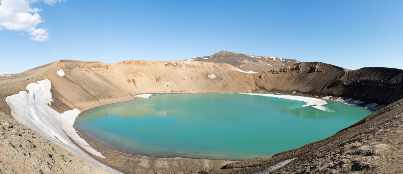 Daarna is het nog maar een klein stukje tot de Viti krater. En dit is waarschijnlijk de gemakkelijkste te bezoeken krater van IJsland. De parkeerplaats is letterlijk op de rand. Gelukkig kan je hier ook weer een eind over de kraterrand lopen en dat doen we dan ook. Deze krater ligt er echt heel fraai bij. Hij is gevuld met een kratermeer waar nog grote stukken ijs in ronddrijven. En aan de schaduwkant van de krater ligt nog een flink stuk met sneeuw. Het water heeft een prachtige blauwgroene kleur en het geheel steekt schitterend af tegen de blauwe hemel. Erg fraaie plek.