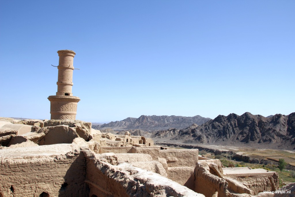 De volgende dag maken we een tripje via het hostel. Samen met een jongen uit Slovenië op pad. We gaan langs drie bezienswaardigheden in de omgeving; Karaghnagh, Chak Chak en Meybod. We rijden met wederom zo’n klein wagentje van lokale makelij. Het is ongeveer een uur rijden naar Karaghnagh. De omgeving wordt steeds fraaier. Eerst vlak, maar al snel meer bergachtig met rotsen in prachtige kleuren. Karaghagh is ook een lemen dorpje maar dan nog geheel in de originele, vervallen staat. Het ligt prachtig aan de rand van een vallei. Het zijn allemaal kamers en gangen op elkaar gebouwd. Echt een enorm doolhof waar je op heel veel plekken naar boven kan klimmen om op de daken van het uitzicht te genieten. Ontzettend fraaie plek, veel authentieker dan het centrum van Yazd. Stop nummer twee is Chak Chak, dit ligt echt midden in de bergen in de woestijn. Het is niet meer dan een paar gebouwen hoog tegen een bergwand. Maar dit is een erg heilige plek voor de Iraniërs. De gebouwen zijn gemaakt rondom een plek waar water uit de rotswand druppelt. Een uniek iets in deze omgeving. Daardoor is een heel kleine oase ontstaan met wat bomen. En volgens het verhaal heeft een herder hier een visioen gehad dat hij een gebouw moest plaatsen op deze plek. En daaruit is de heilige plek ontstaan. Het is een aardige klim op de trappen omhoog in de hete zon.