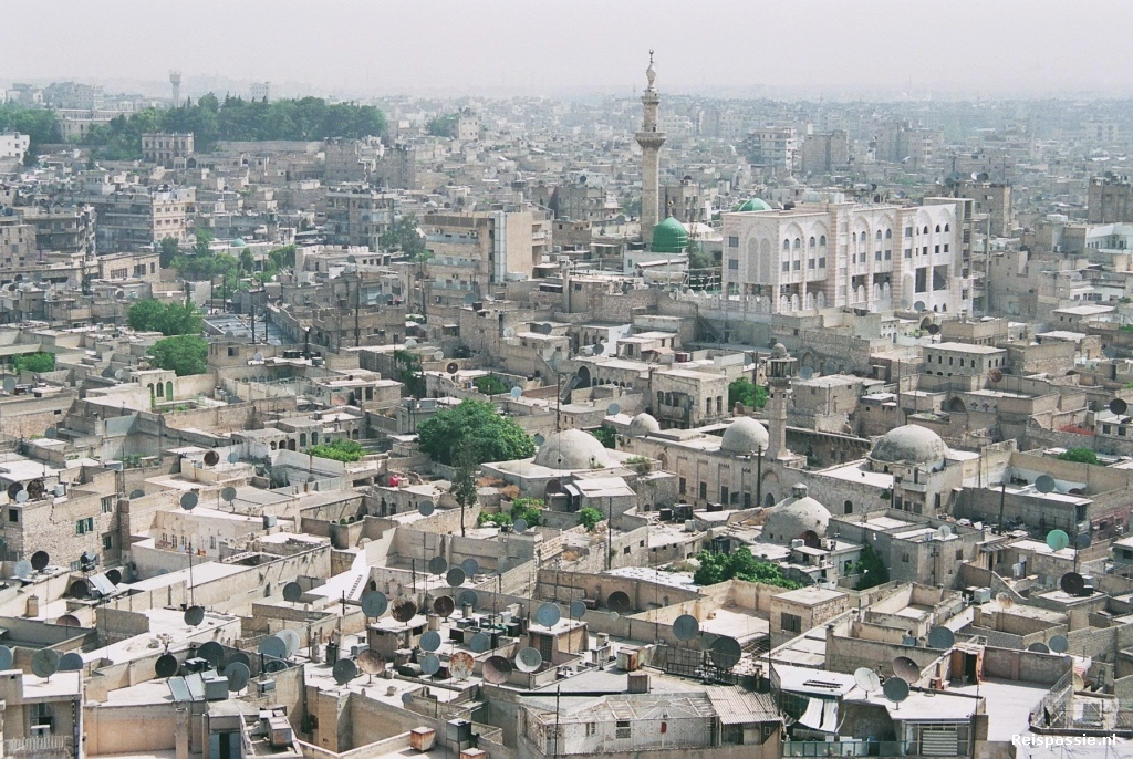 Dag twee in Aleppo eerst naar de citadel gegaan. Dit is de oorsprong van de stad die nu inmiddels 3.6 miljoen zielen telt... Hoog op een heuvel met een diepe, inmiddels droogstaande, gracht er om heen. De entree is indrukwekkend, twee grote torens met daartussen een brug op gewelven geven een geweldige indruk. De toegang naar binnen doet wat aan het kasteel van Krak denken, een slingerende donkere gang omhoog. Binnen de muren valt het wat tegen; niet heel fraai gerestaureerd en eigenlijk ook niet zo heel veel te zien. Wel een prachtig uitzicht op de stad. De minaretten van de moskeeën (er zijn er hier zo'n 1000!) steken fraai boven de brei van woningen en winkels uit. En dat alles bedekt onder een grijsbruine sluier van de smog...